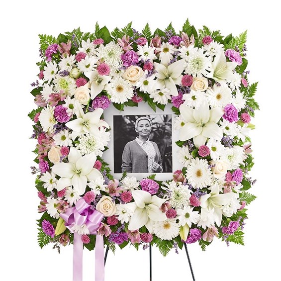 Offer solace with a sentimental arrangement for the services. Our square wreath features soothing-hued blooms and greenery for a lush, full presentation. A photo can be displayed in the center, creating a unique and beautiful tribute to a cherished loved one.